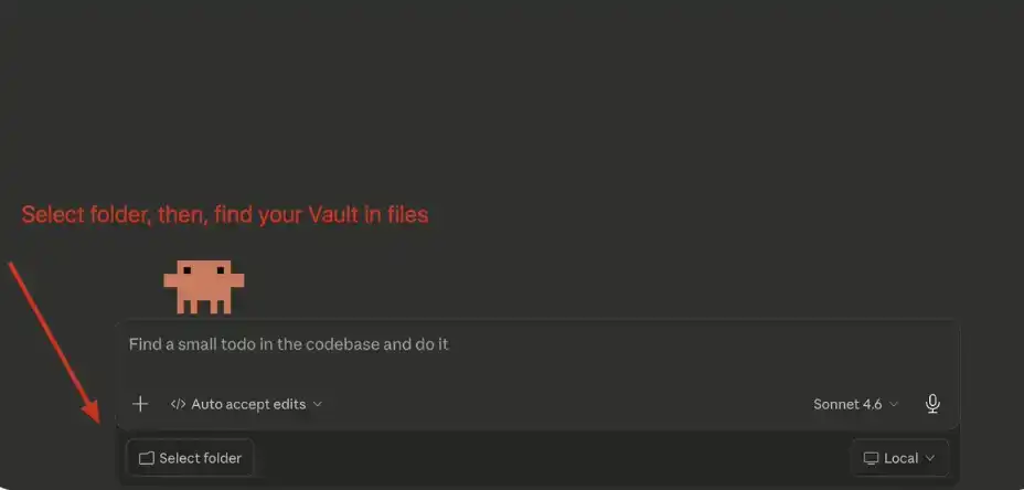 在主聊天界面中,点击「Select Folder(选择文件夹)」,然后找到你刚刚创建的 Obsidian Vault 并选中它即可。