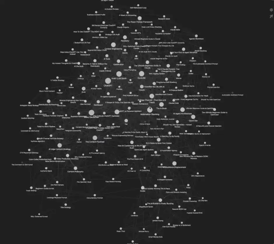我几乎搭建出了一个「AI 第二大脑」,把我所有的思考、阅读、写作、线上研究等内容都纳入其中。这里面包含了我的商业计划、我发布过的所有 YouTube 视频、写过的文章,以及一切对我重要的内容。
