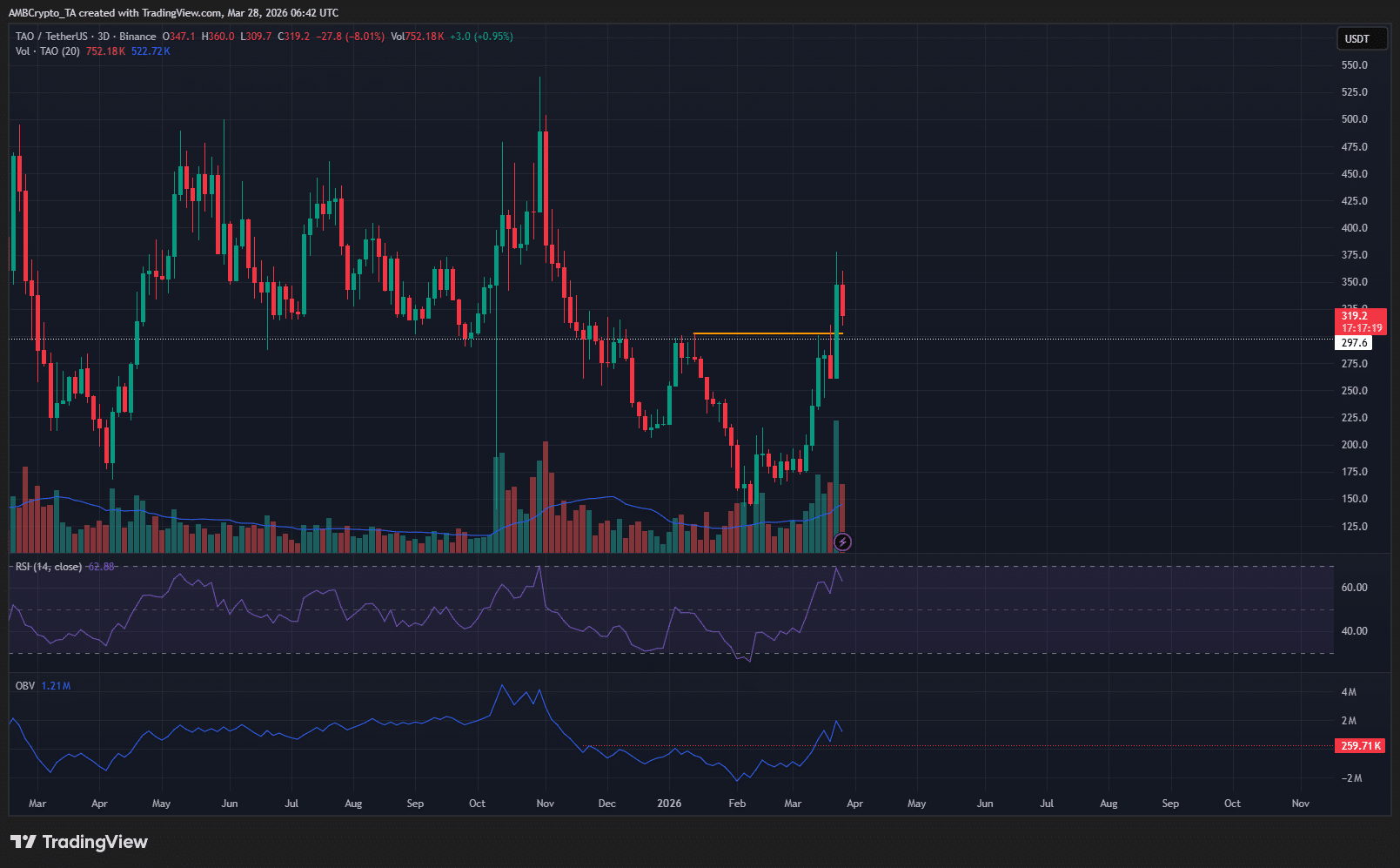 Bittensor [TAO] 持续在300美元心理关口上方交易。尽管过去一周市场领导者比特币[BTC]和以太坊[ETH]面临强大的抛售压力并被迫录得下跌,TAO仍延续上涨趋势。