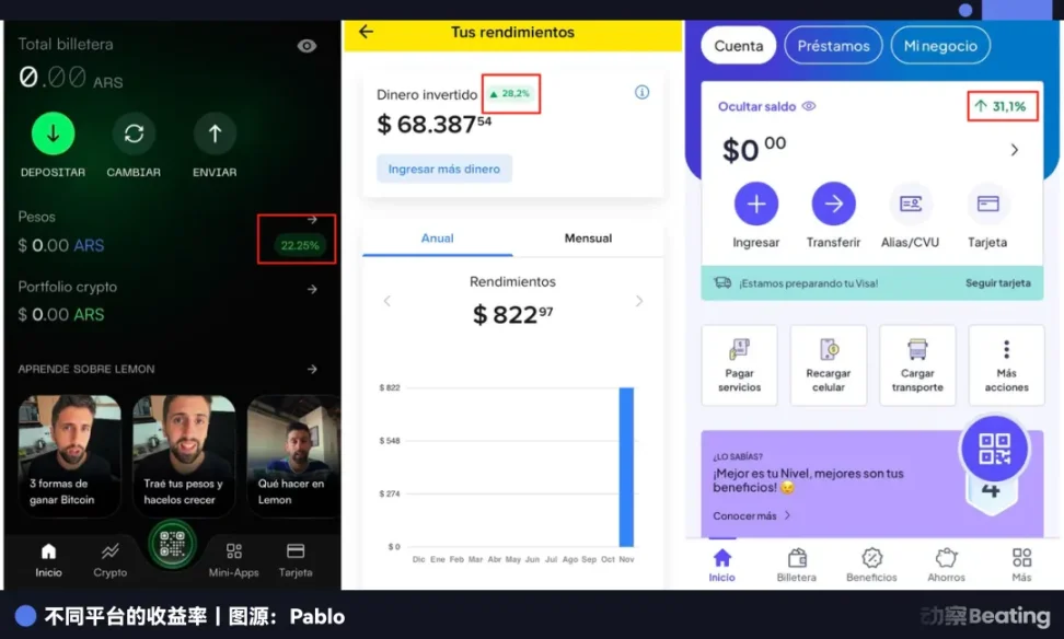 Pablo 在采访中提到了阿根廷中产的「理财智慧」。比如利用 Mercado Pago 等平台高达 30%~50% 的年化收益率来存活期。