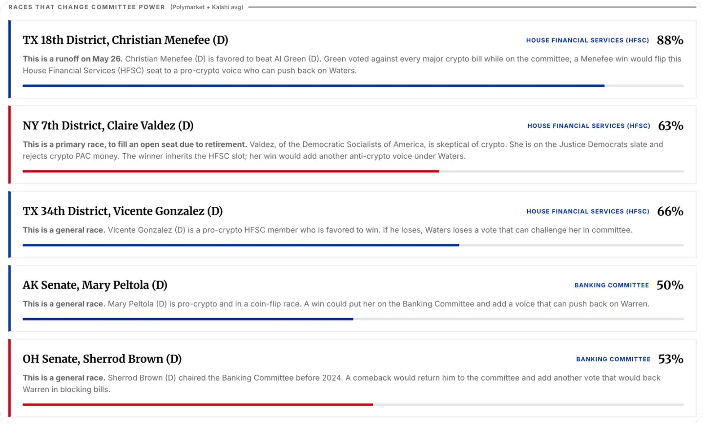 民主党夺回众议院的概率高达 85%,这意味着 Waters 将大概率执掌众议院金融服务委员会,拥有重组小组委员会、掌控立法议程的绝对权力。仅存的亮点极为有限:Menefee 有望击败 Green 夺得席位,Gonzalez 大概率能保住现有席位。这些情况或许能形成一定制衡,但无法改变权力核心 —— 主席职位的归属。