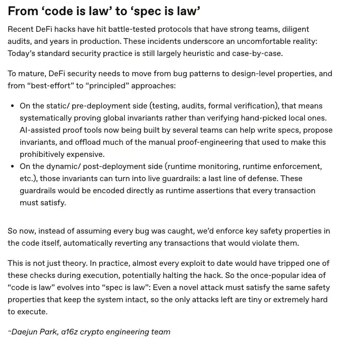 a16z 得出的结论(也是业界目前普遍认同的结论)是,安全必须向上提升一个层次:从检查代码是否正确 ,到强制执行系统级不变性是否绝对不容破坏 。这标志着安全策略从“代码即法律”向“规范即法律”的转变,协议正式定义了哪些规则必须始终成立(例如抵押品限额、价值守恒、偿付能力条件、排序约束),并持续强制执行这些属性,而不仅仅是在部署时才执行。