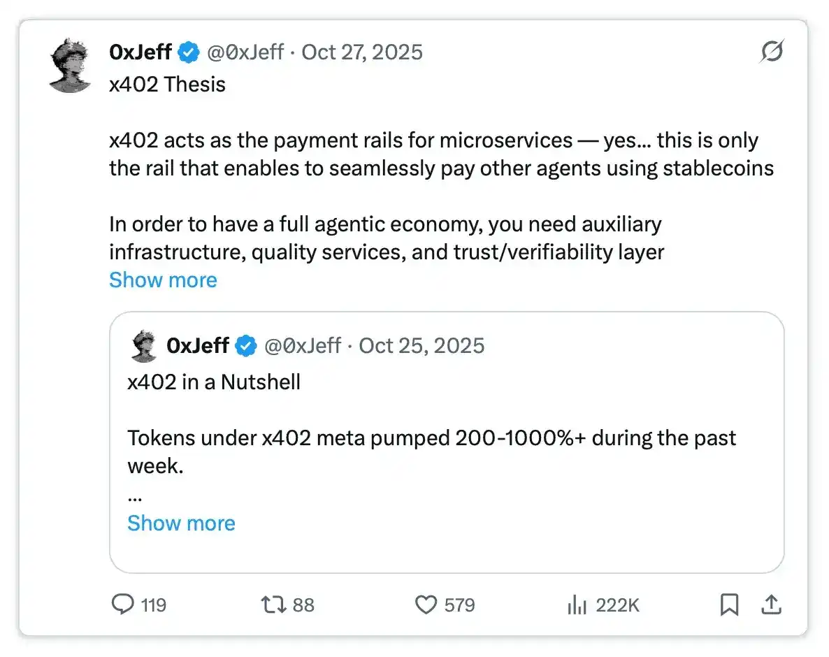 - x402 生态系统: 关注点:通过原生 HTTP 级结算,推动“为 Agent 服务”及“由 Agent 执行”的可编程支付的进展。