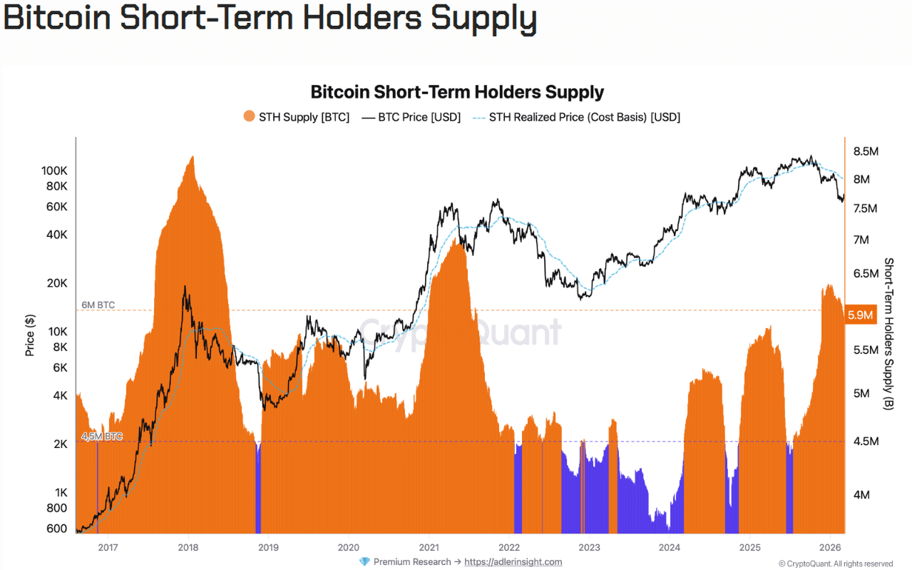 据加密货币分析师小阿克塞尔・阿德勒(Axel Adler Jr.)观察,短期持有者仍在持续亏损卖出。短期持有者(STH)持仓量从 606 万枚 BTC 降至 592 万枚,意味着有 14 万枚比特币脱离该群体。这一方面可能源于投降式抛售;另一方面,部分持仓持有周期超过 155 天(跨过短期持有者阈值),也导致短期持有者供应量下降。