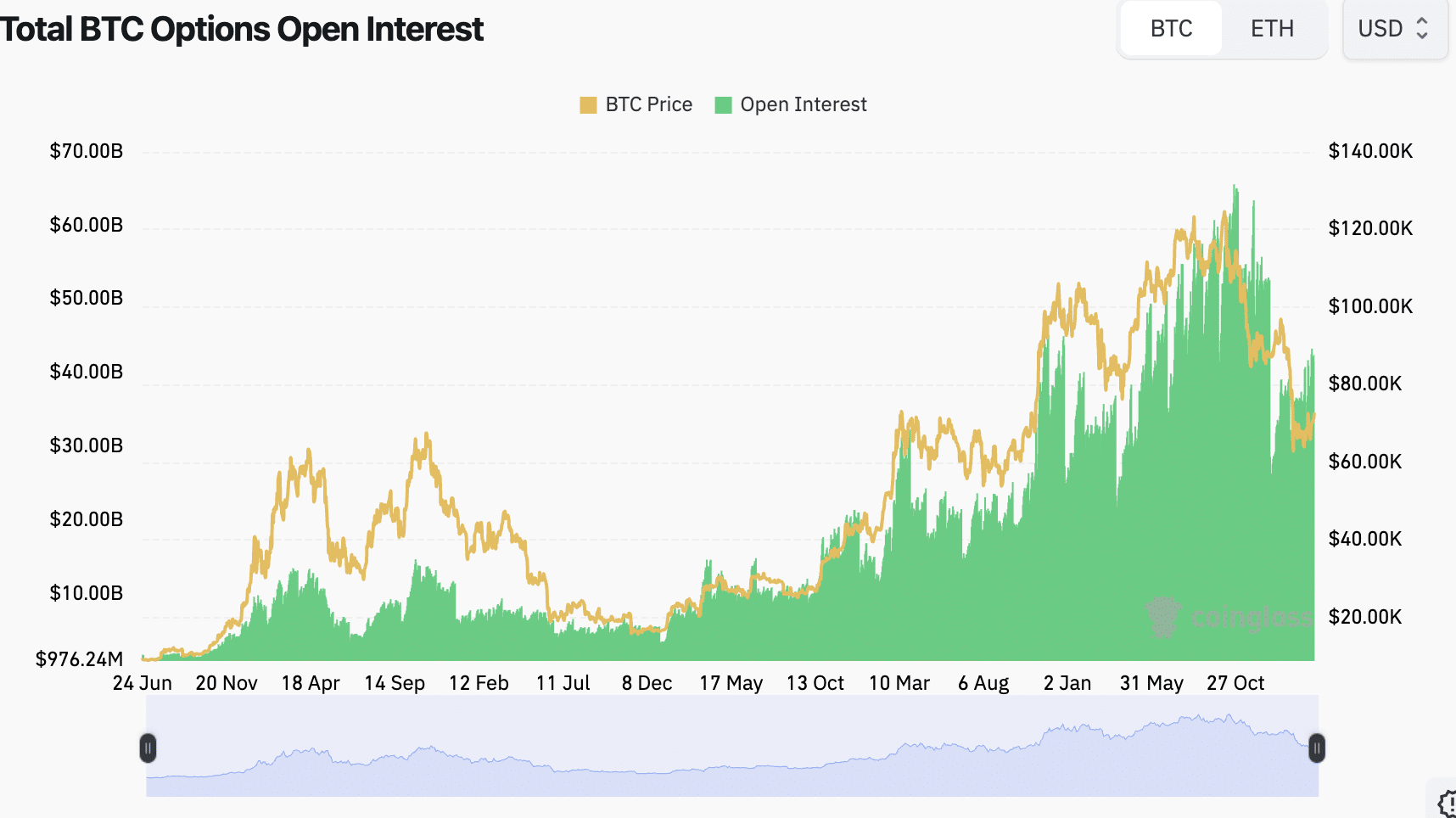 Coinglass的数据显示,比特币期权未平仓合约超过410亿美元,反映了衍生品在塑造市场动态方面日益增长的作用。