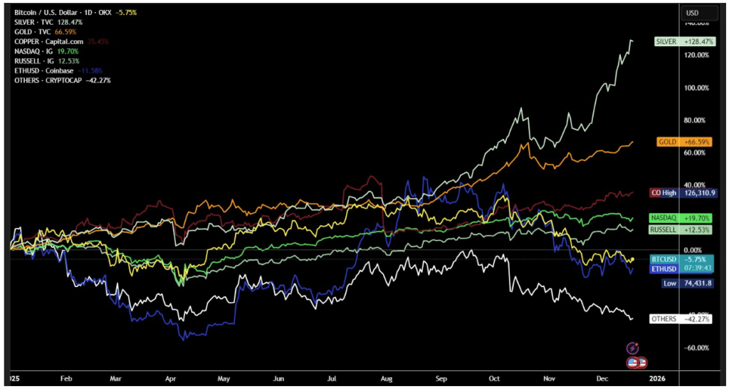 2025年的表现数据揭示了传统市场与数字资产之间的巨大差异,且这一差距随着年内进程持续扩大。根据社交媒体平台X上‘Bull Theory’披露的数据,白银是2025年表现最佳的资产,年内涨幅约130%。黄金位列2025年表现第二佳的资产,涨幅约65%,而铜价则攀升近35%。这些数字反映了大宗商品领域的持续强势。