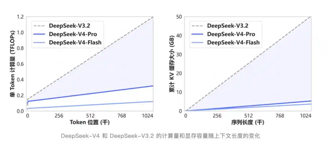 V4开创了一种全新的注意力机制,在token维度进行压缩,结合DSA稀疏注意力一起用。相比传统方法,对计算和显存的需求大幅降低。