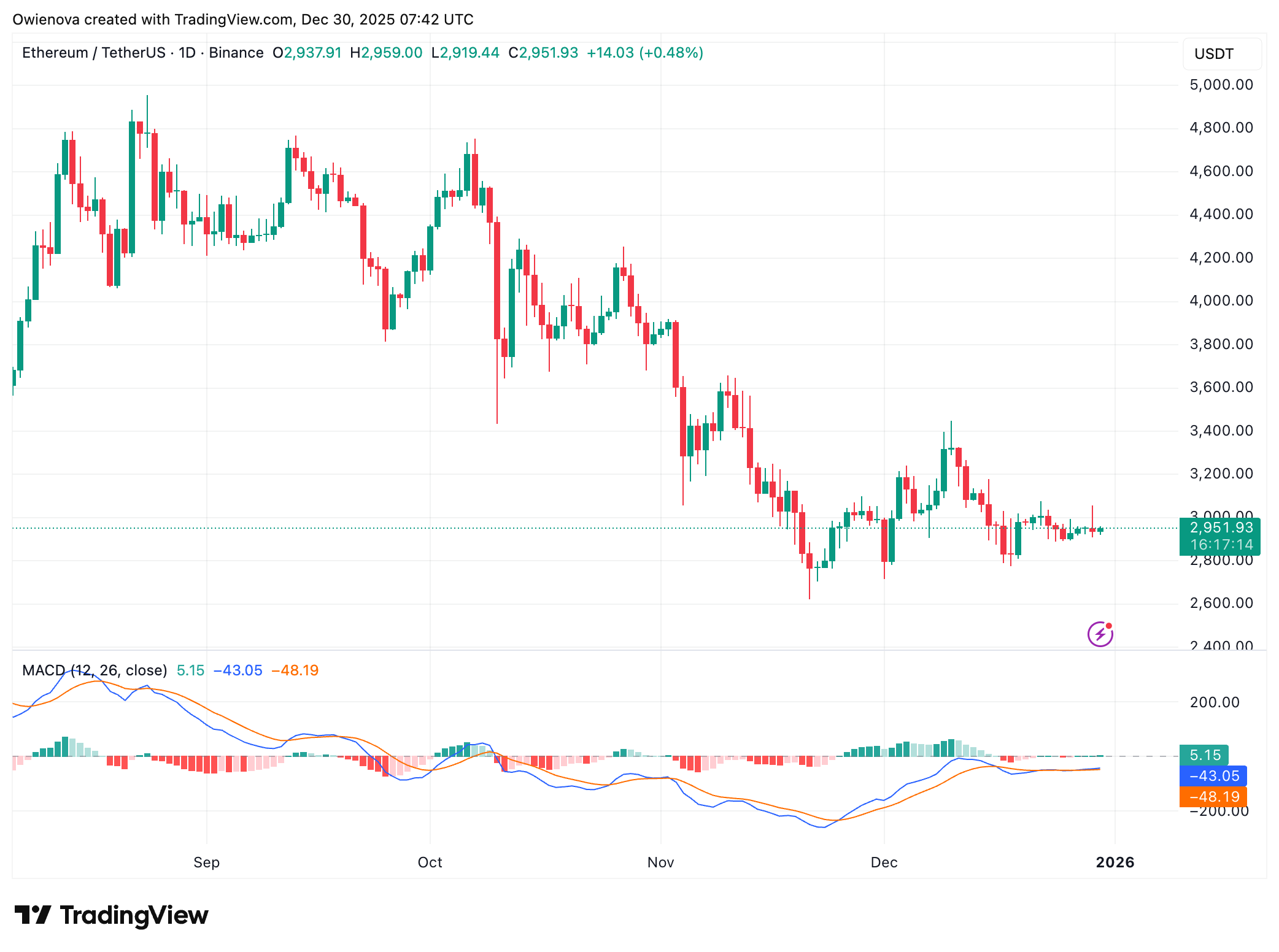 ETH日线图交易价格2,951美元 | 数据源:Tradingview.com上的ETHUSDT图表