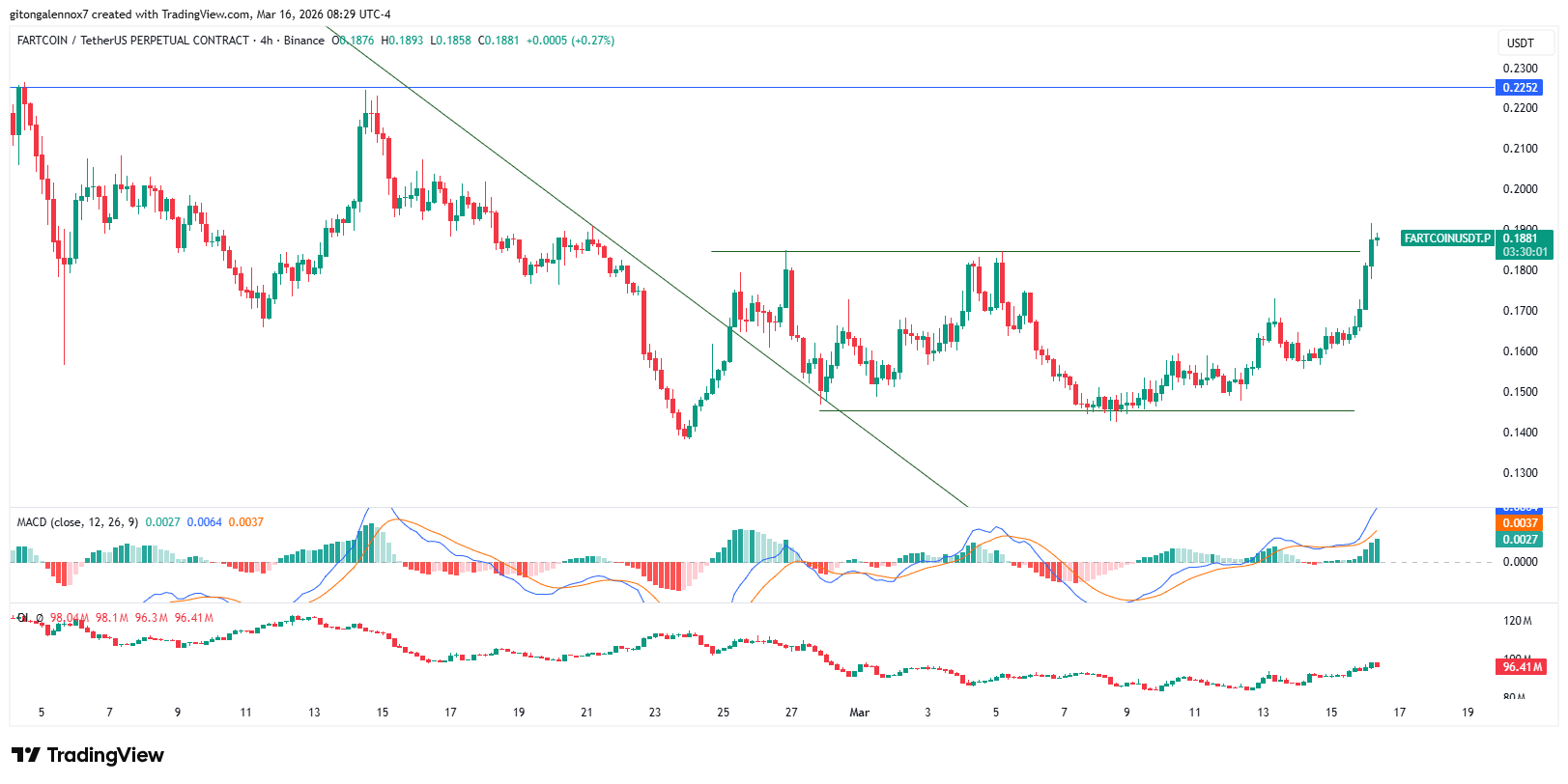在日线图上,FARTCOIN突破下降趋势线,价格目前交易于0.1894美元附近。如先前分析,自突破该日线趋势线以来,四小时图持续 consolidating(盘整)。