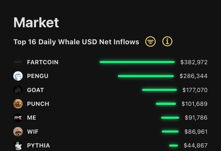 A主要原因是大量鲸鱼资本流入,数据显示FARTCOIN在Solana模因币中每日资本流入领先,达到38.3万美元,超过了其他模因币如Pudgy Penguins。