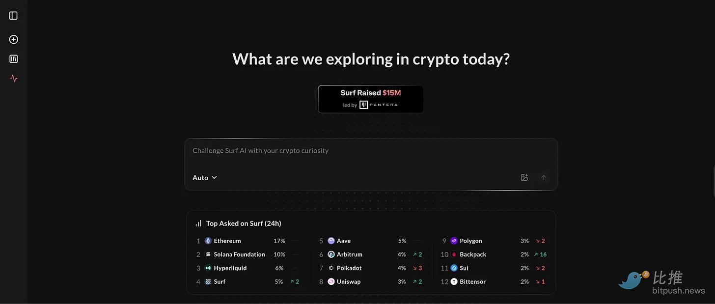 Surf 等项目通过提供加密专用的 AI 研究工具来解决这一问题,这些工具能够整合分散的数据源。在加密领域的所有 AI 用例中,研究的门槛最低,不需要任何编程或交易专业知识。