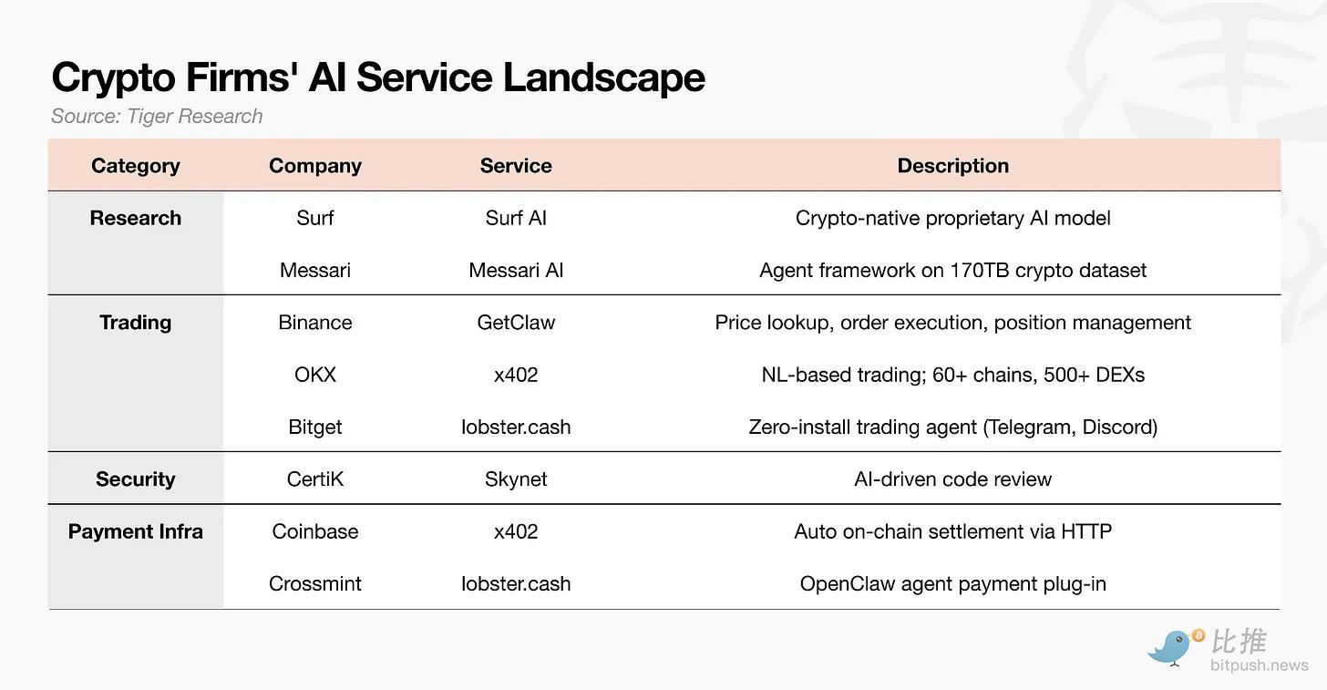 跨行业布局: 交易所、安全、支付和研究领域的加密公司正同步推出 AI 服务。