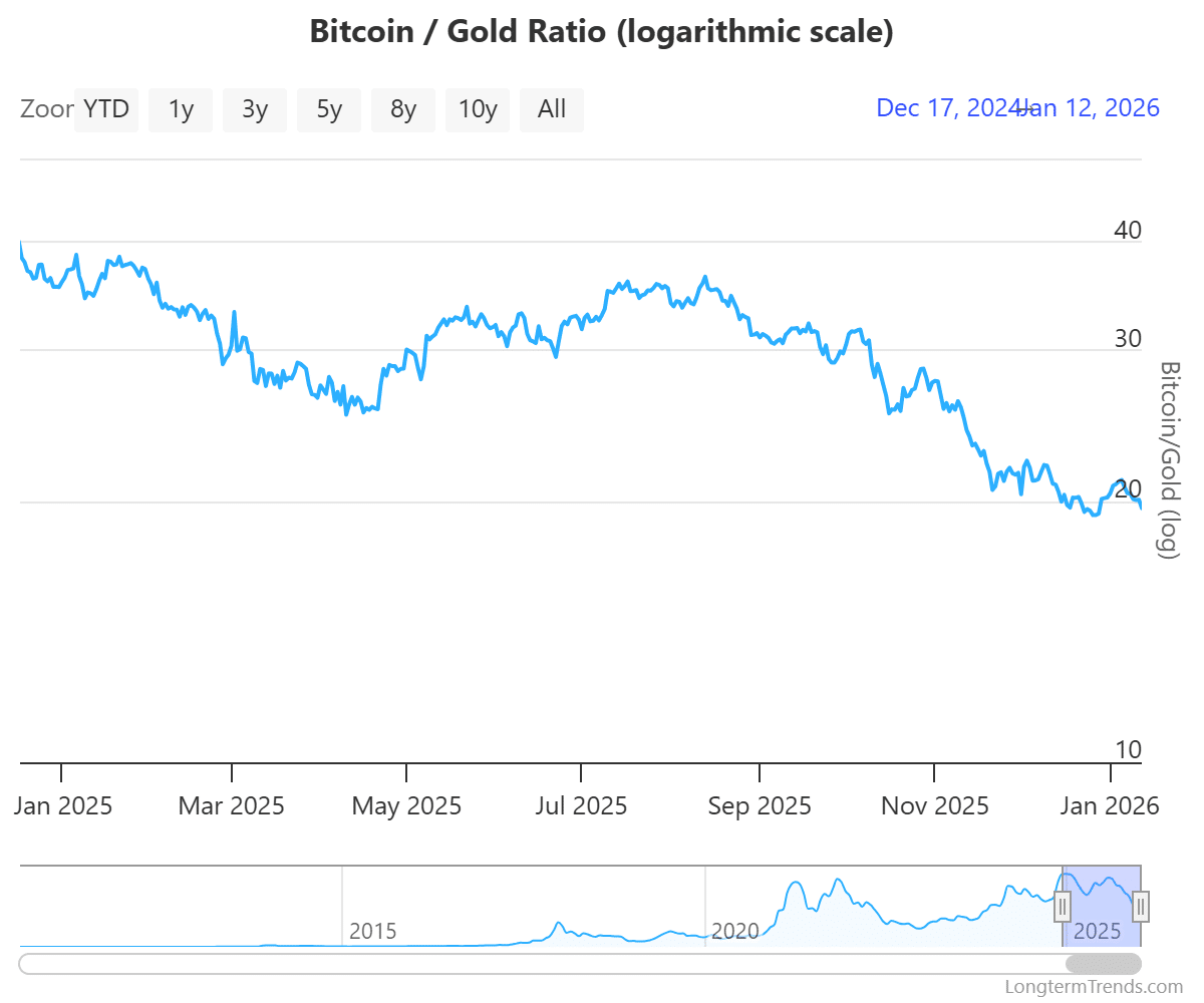 黄金在 2025 年年末斩获了高达 65% 的收益率,反观比特币则表现疲软,全年收益率为 - 6%。这一强弱分化的直接结果是:比特币 / 黄金比率已跌至 20,意味着当前兑换 1 枚比特币需要付出 20 盎司黄金的代价,而在 2025 年年初,这一兑换比例仅为 35 盎司。