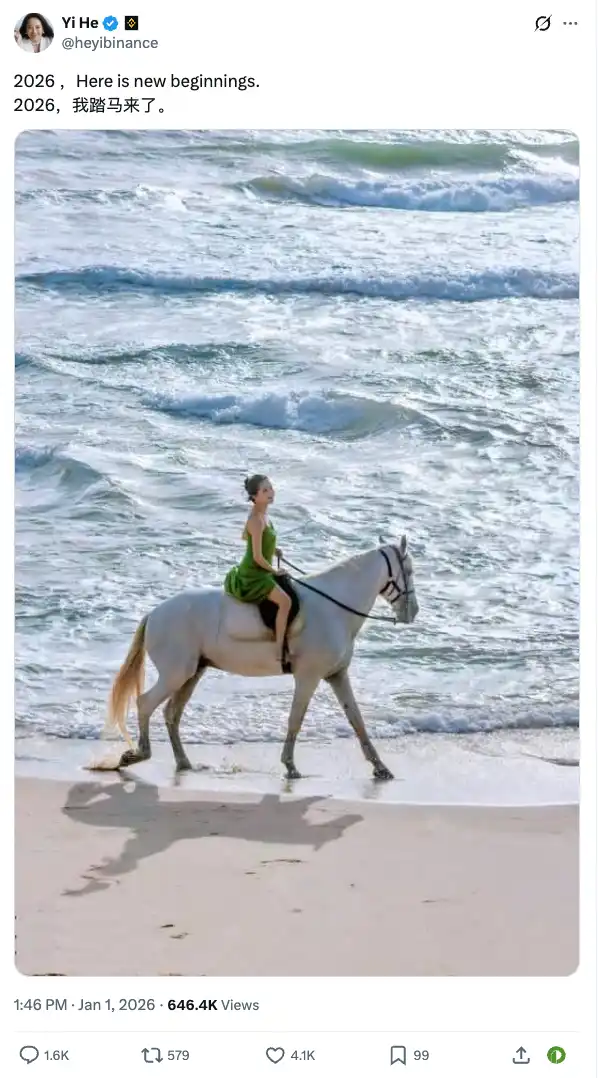 1 月 1 日,新年伊始,币安联席 CEO 兼联创何一发文庆祝自己开启新的一年,配文为“2026,新的开始;2026,我踏马来了。”配图为其本人在海边骑着一匹白马的照片,颇具万象更新的气度,评论区则是清一色的称赞和共同庆贺。