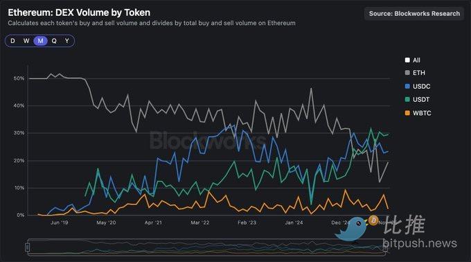 ETH 作为 MoE 的主导地位正在下降,而 USDC 和 USDT 在交易量图表和顶级 Uniswap 资金池中的受欢迎程度正在上升。