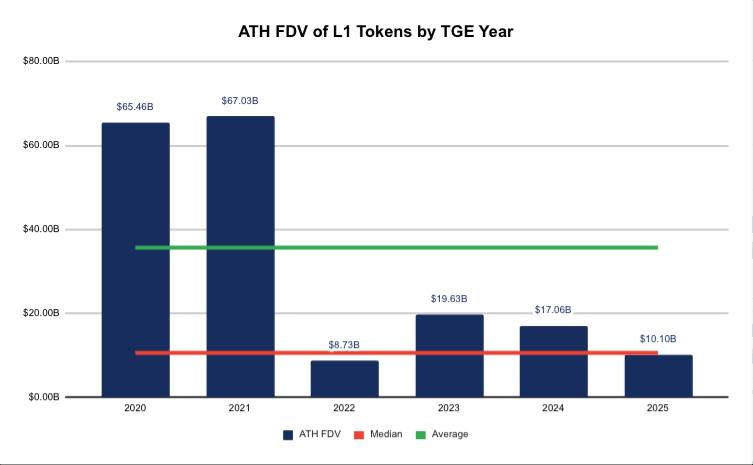 Odaily注:各年度 TGE 的 Layer1 代币历史最高完全稀释估值(ATH FDV)统计。