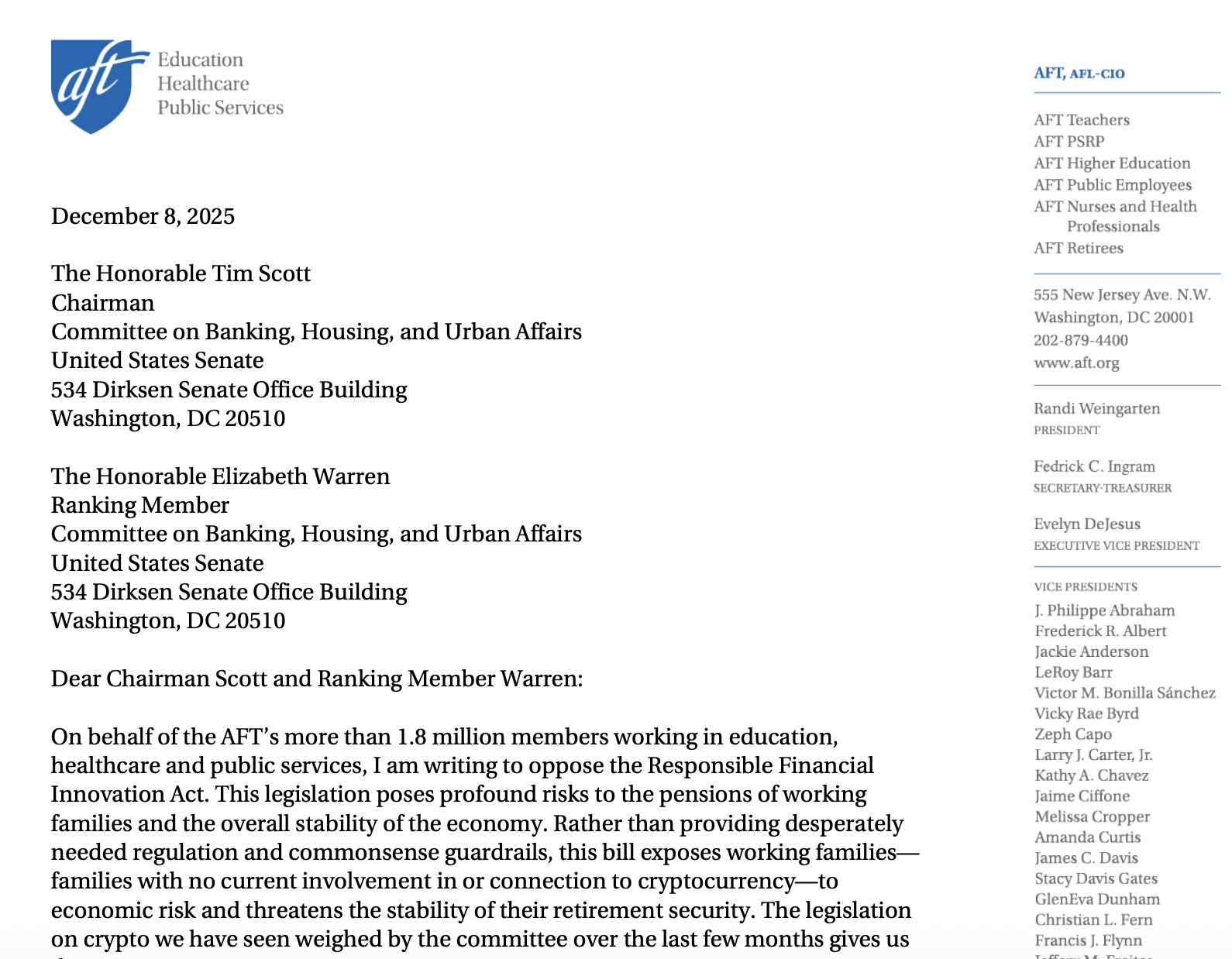 美国教师联合会(AFT)近日对参议院正在推进的加密货币市场结构立法表示反对,声称该法案"威胁到教师退休保障的稳定性"。这个代表全美教育工作者的工会组织在致参议院银行委员会两党领袖的信函中表示,反对通过《负责任金融创新法案》——该法案被参议员称为是对众议院《CLARITY法案》市场结构解决方案的"拓展"。