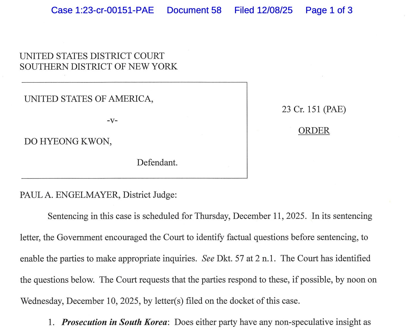在纽约南区美国地方法院周一提交的文件中,法官保罗·恩格尔迈尔向Kwon的律师及代表美国政府的律师询问了这位Terraform联合创始人在韩国可能面临的指控和「最高及最低刑期」——他预计在美国服刑后将被引渡至韩国。