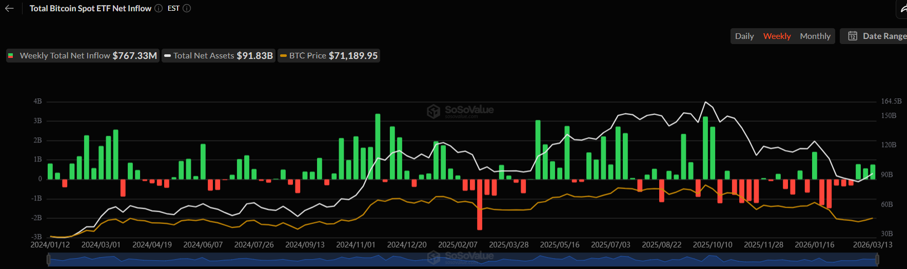 尽管信贷市场面临压力,机构资本继续通过受监管的加密ETF流入。过去一周,比特币ETF录得7.673亿美元净流入。