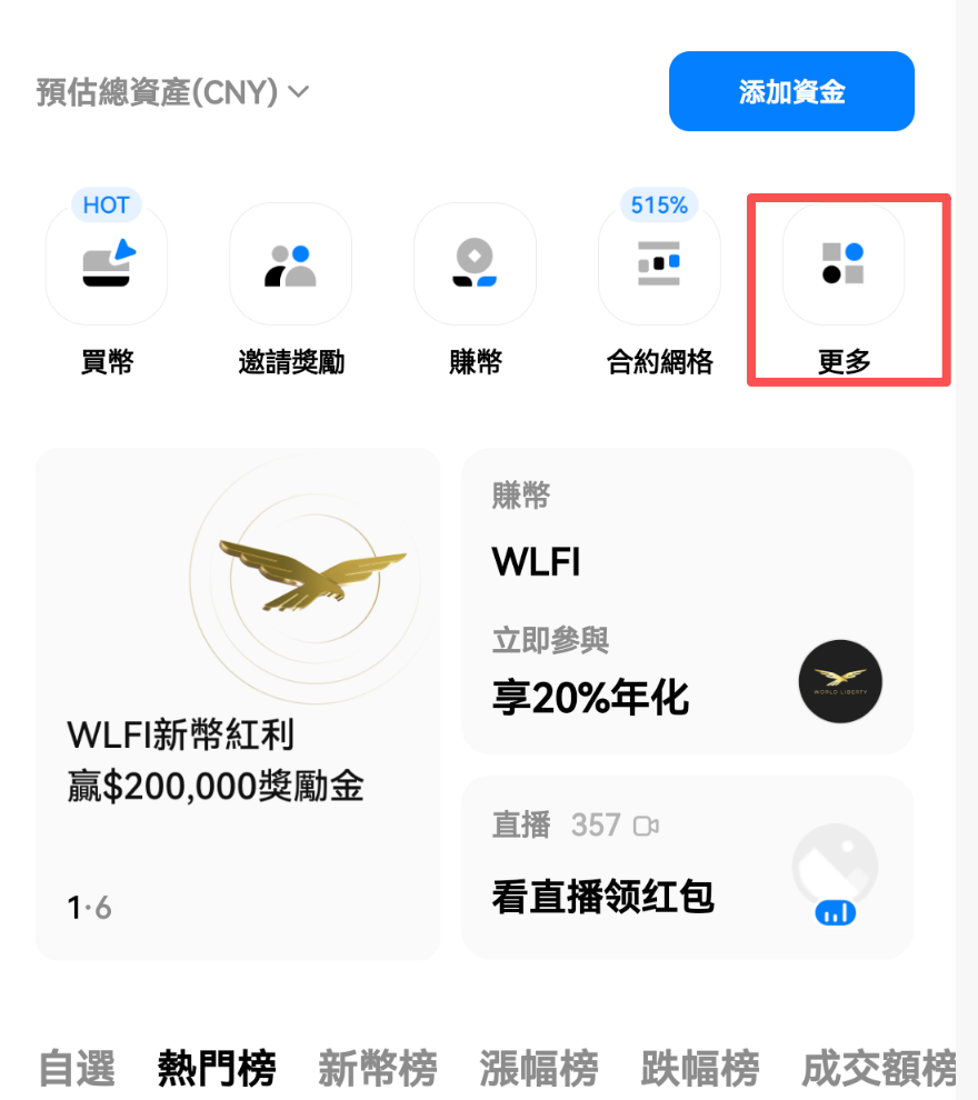 登入HTX APP,點選主頁面的[更多],然後選取[保證金換幣],並依照以下步驟操作開始借幣: