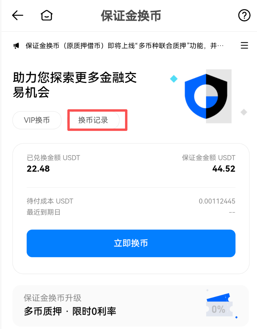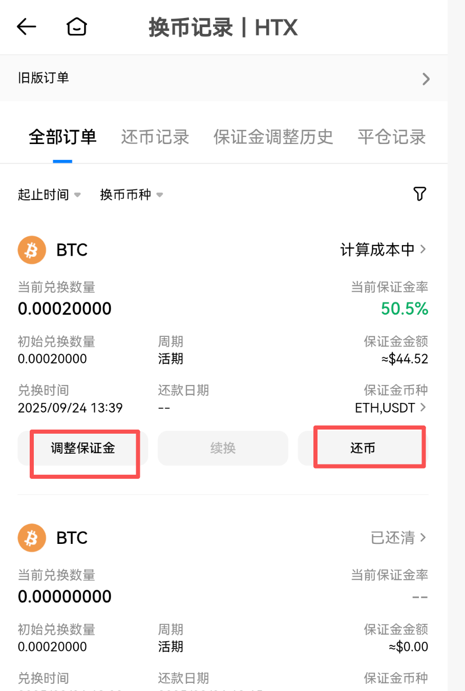 前往質押借幣頁面,點選【換幣記錄】選取[還幣記錄],即可進入還幣記錄頁面並查看所有還幣資訊。