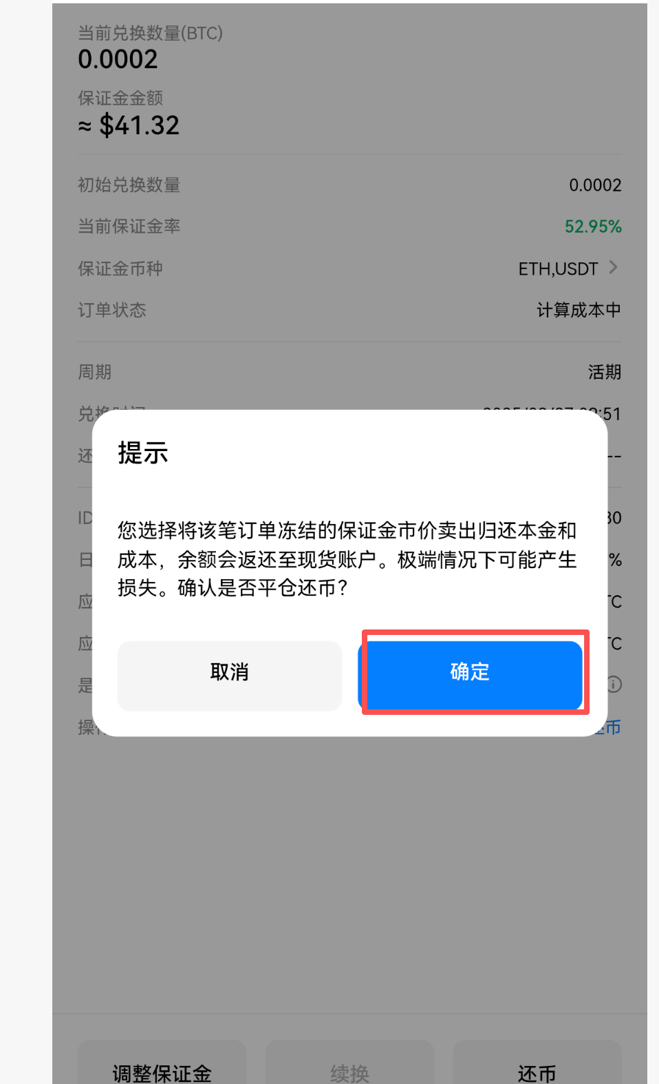 注意事項:使用此功能表示您選擇以市價賣出此訂單凍結的所有質押資產來償還借幣與利息,償還後如有餘額將劃轉至您的幣幣帳戶。在市場大幅震盪時使用此功能可能造成資產損失。
