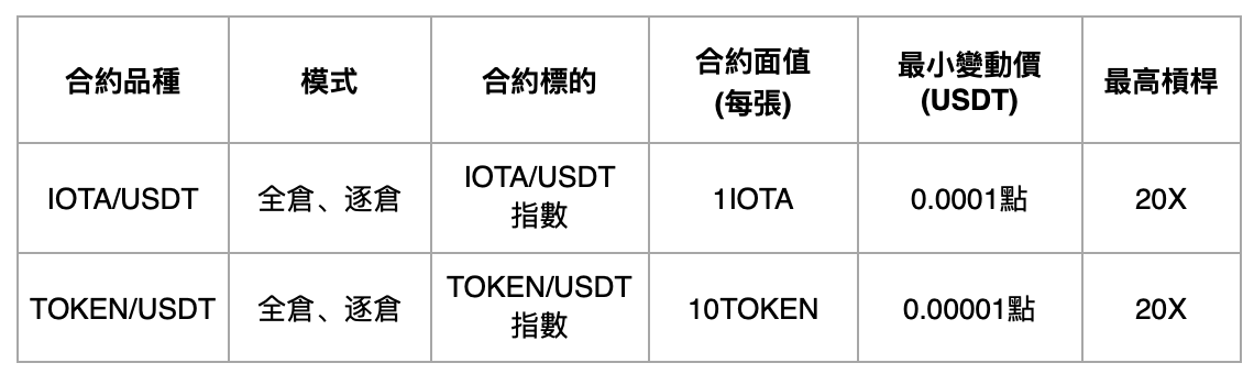 HTXHTX將於 2023 年 12 月 4 日 18:00(GMT+8)起推出 USDT 本位合約:IOTA/USDT和TOKEN/USDT。USDT本位永續合約商品相關條件如下: